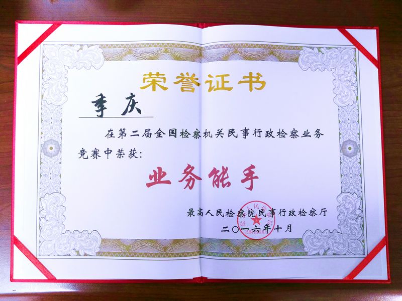 季庆同志荣获“全国检察机关民事行政检察业务能手”称号