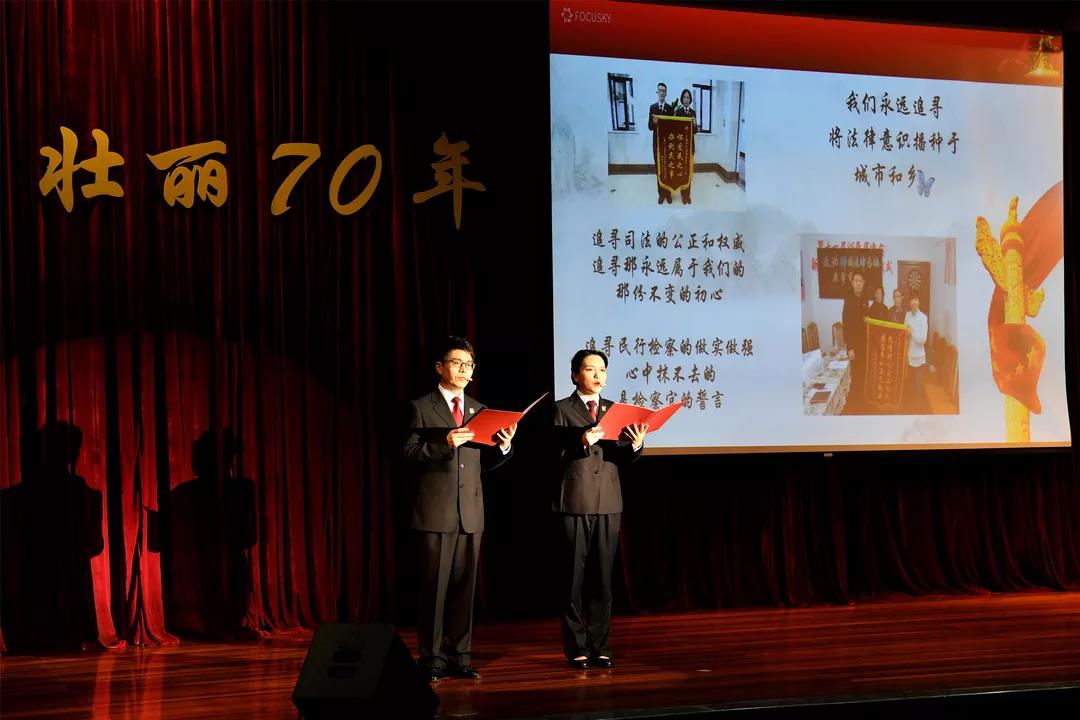 9月25日, 为庆祝新中国成立70周年,我院举办“壮丽70年 奋斗新时代”诵读会。来自全院12个部门的干警代表们,用满腔热情讴歌新中国成立70周年辉煌成就、抒发检察干警家国情怀。院党组书记、检察长陈思群同志在致辞中勉励全院干警不忘初心、牢记使命,以坚如磐石的信心、只争朝夕的劲头、坚韧不拔的毅力,一步一个脚印把检察事业推上新台阶,以优异的检察业绩献礼新中国成立70周年。