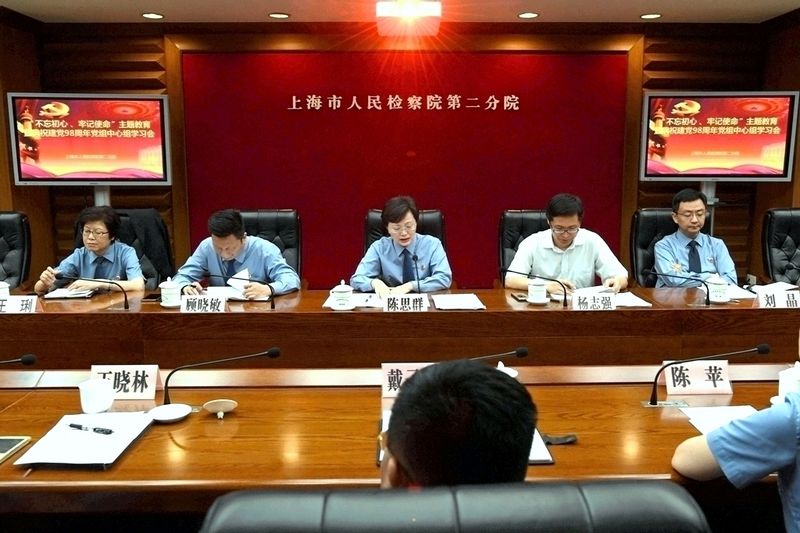 7月1日下午,我院召开“不忘初心、牢记使命”主题教育暨庆祝建党98周年党组中心组学习研讨会,党组书记、检察长陈思群同志主持会议。会前,陈思群检察长带领党组中心组成员重温入党誓言。会上,党组成员、副检察长顾晓敏同志交流了学习体会,党组成员、副检察长刘晶同志传达学习习近平总书记在中央政治局第十五次集体学习时的重要讲话精神。市委第八巡回指导组派员到会指导,党组成员、局级干部和各部门主要负责人参加了会议。党组班子成员及部分部门负责人进行了交流发言。
