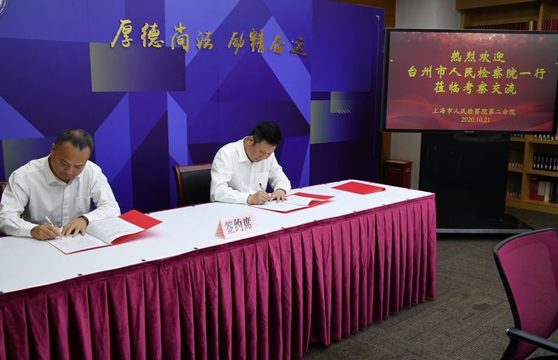 10月21日,浙江省台州市检察院党组书记、检察长王美鹏同志一行来我院考察交流。我院党组书记、检察长陈思群,党组成员、副检察长顾晓敏,党组成员、政治部主任余杭明出席。与会双方介绍了检察工作总体情况,对特色工作进行了交流座谈,并就金融检察、公益诉讼检察工作签署了合作协议。