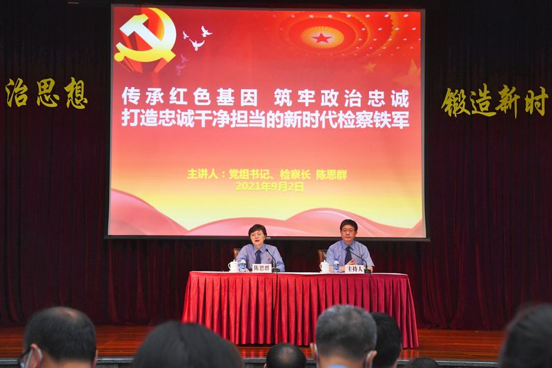 9月2日上午,为深入推进我院第二批检察队伍教育整顿学习教育,党组书记、检察长、教育整顿领导小组组长陈思群以“传承红色基因 筑牢政治忠诚 打造忠诚干净担当的新时代检察铁军”为主题,结合教育整顿要求、检察工作实际和个人学习体会,向全院干警讲授专题党课。党组成员、政治部主任余杭明主持会议。