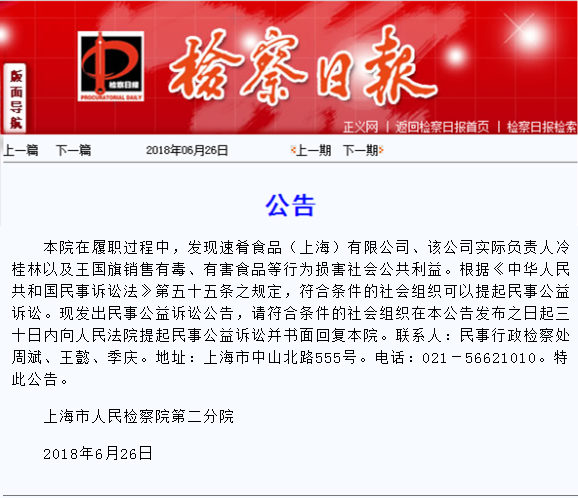 上海市人民检察院第二分院在履职过程中,发现速肴食品(上海)有限公司、该公司实际负责人冷桂林以及王国旗销售有毒、有害食品等行为损害社会公共利益,遂于今年3月14日对该公益诉讼线索依法立案并开展调查。6月26日,二分院依法通过《检察日报》发布民事公益诉讼公告。