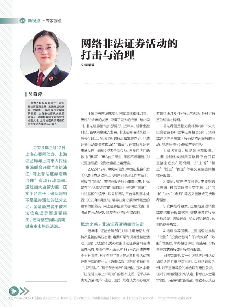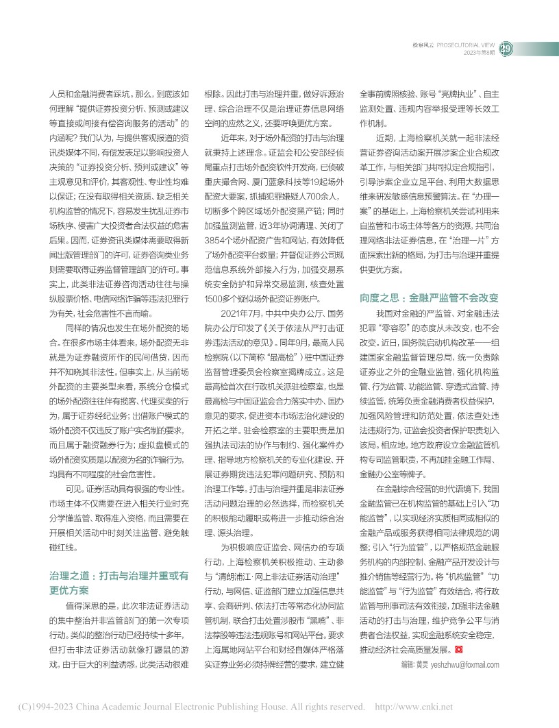 2023年2月17日,上海市委网信办、上海证监局与上海市人民检察院联合开展“清朗浦江·网上非法证券活动治理 ”专项行动部署。通过加大监管力度,压实平台责任;确保网络不是证券活动的法外之地,金融消费者不被不法信息误导而遭受损失;还网络空间以清朗,赋资本市场以法治。