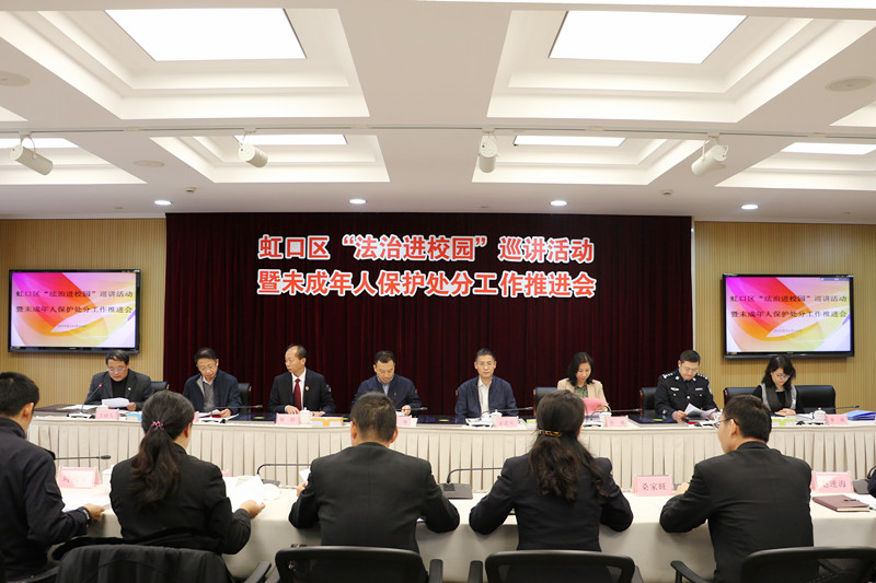 11月10日下午,虹口区“法治进校园”巡讲活动暨未成年人保护处分工作推进会在我院召开。我院党组书记、检察长金建庆,市院未检处处长吴燕,市教委青保处处长朱坚,虹口分局指挥处处长金晓林,区教育局副局长李琰,我院党组成员、副检察长骆群等领导出席。会议由区未保办主任陈再跃主持,区“法治进校园”巡讲活动基地学校校长和政教主任、首批区“法治进校园”巡讲团成员以及未检科全体干警、我院法制宣讲团成员参加会议。