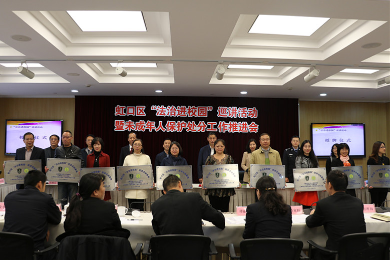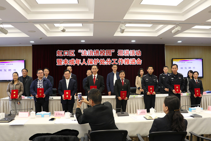 会上,我院未检科科长付丽娟、上海市广中学校政教主任史磊分别对《虹口区“法治进校园”巡讲活动实施方案》、《关于建立未成年人保护处分制度的实施意见》进行了解读。与会领导向10所巡讲活动基地学校的代表授牌,以及向首批来自公检法司社的9名区“法治进校园”巡讲员颁发聘书。之后,区检察院、区公安分局和区教育局领导就联合制定的《关于建立未成年人保护处分制度的实施意见》进行了签约。
