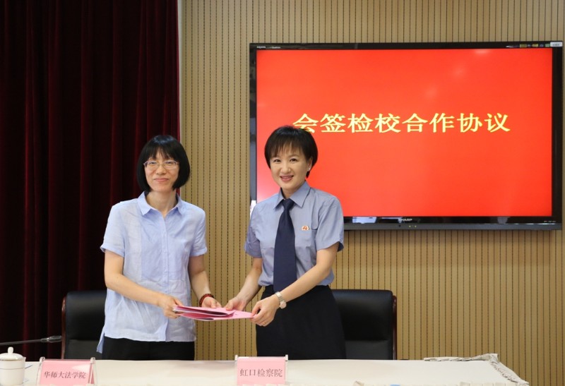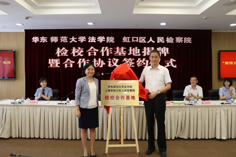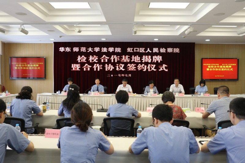 7月21日上午,我院与华师大法学院举行检校合作基地揭牌暨合作协议签约仪式。我院党组书记、检察长金建庆,华师大法学院党委书记张惠虹,我院副检察长陈俊,党组成员、政治部主任肖蓉晖,华师大党委统战部部长方奇华,华师大法学院副院长、副教授岑峨,法学院教授黄欣,法学院讲师、法学博士黄翔,法学院晨晖学者、法学博士孟凡壮,法学院教学工作秘书汪望,我院反贪局、公诉科、侦监科、航运(金融)科、未检科、监所科、民行科、研究室、办公室等部门相关领导及代表,华师大法学院学生代表,我院青年干警代表等共同出席了会议。
