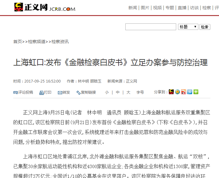 近日我院召开金融检察白皮书发布会暨“打击金融犯罪、防范金融风险、服务金融发展”工作联席会议第一次会议,20余家媒体应邀参加。会后,新华社、劳动报、上海法治报报道了虹口金融检察白皮书主要内容,上海日报以全英文形式对白皮书内容和联席会议情况进行了报道,新民晚报、上海支部生活、检察风云以3000余字篇幅进行了长篇报道,上海电视台法治频道制作并播放了近5分钟的虹口金融检察专题片,平安上海栏目视频报道了会议全过程,正义网、东方法治网、搜狐网等主流网站均以较大篇幅对活动进行了报道。上海法治报近期将以整版报道金融犯罪典型案例。