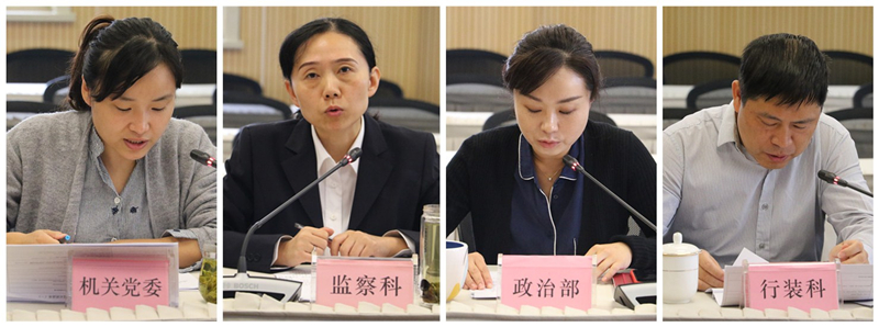 会上,监察科、机关党委、政治部、行装科分别就各自工作作了相关责任落实及整改情况汇报,随后其他部门就“一岗双责”、全面从严治党责任落实等提出了相应的意见和建议。