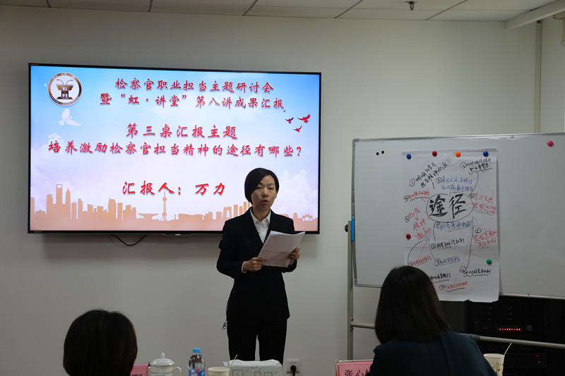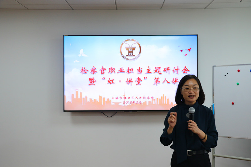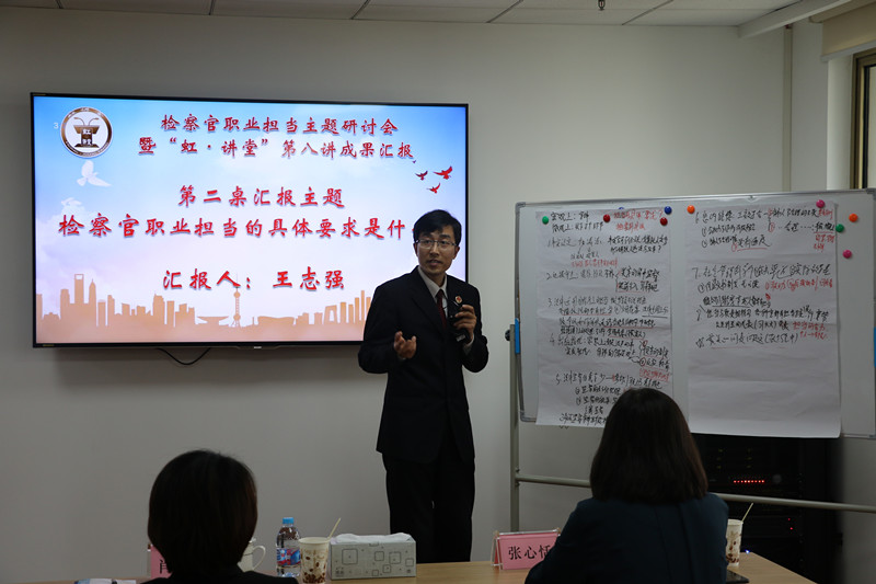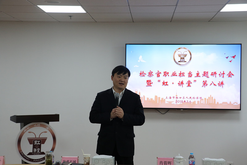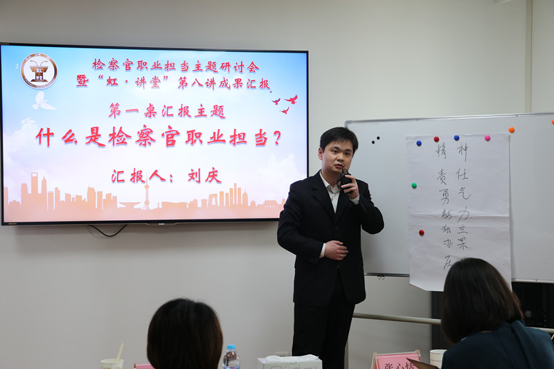为进一步突出检察官办案主体地位,引导全院干警弘扬检察职业精神,强化检察职业担当,树立有灵魂、有本领、有担当、有温度的新时代检察官形象,打造我院检察官职业担当品牌亮点,近日我院举行了检察官职业担当主题研讨会暨“虹·讲堂”第八讲。院党组成员、副检察长皇甫长城,院党组成员、政治部主任肖蓉晖,市院政治部教育处副处长张心恬出席活动。我院2017年市级、院级“三优一能”称号获得者、院青年英才库成员、检委会专业研究小组成员及部分40岁以下检察官代表共27人参加了活动。活动由政治部副主任徐丹丹主持。