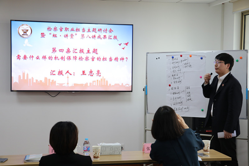 讨论结束后,4位桌长结合各组的讨论内容,围绕上述议题进行了精彩的交流汇报。第一桌桌长控申科副科长刘庆把检察官的职业担当概括为精神、责任、勇气、能力、独立、办案、压力和公益等八个方面,并透过具体事例对这八个要素进行展开解读,最终将检察官的职业担当归纳为:为了维护社会的公平正义、在依法独立办理案件,特别是疑难复杂、具有风险的案件过程中,不惧压力,有勇气、有能力办好案件,并承担由此带来的责任的担当精神;第二桌桌长案管科王志强从宏观和微观两个角度,把抽象的检察官办案环节作为切入点,对检察官职业担当的具体要求进行了提炼和归纳,如:在事实认定上,要不怕得罪人,忠于事实和法律;在证据审查方面,要注重类案的集中监督,注重提前介入,引导取证;在出庭指控上,要早作预案、有备无患。在法律监督上,要灵活适用各种法律、依托相关制度建立保障机制等;第三桌桌长民行科副科长万力运用思维导图的形式,从职业精力的保障、物质和精神的激励,先进典型的选树、科学的考评机制、合理的职业前景的规划等十三个方面层层递进、条条展开,对培养激励检察官担当精神进行了生动阐述。第四桌桌长侦监科副科长王志亮从如何保障检察官能担当、敢担当、想担当等三个方面,就建立履职保护机制、容错机制、关怀机制、咨询机制和激励机制等五项机制措施逐一进行了解释说明和观点分享。