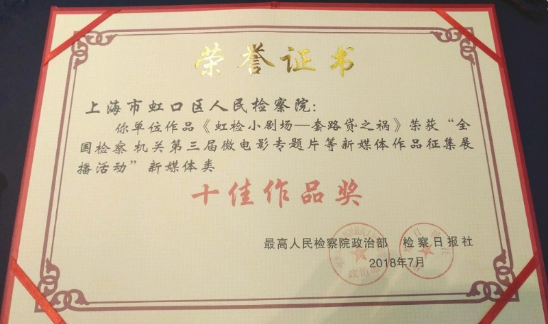 本次活动由高检院政治部与检察日报社联合主办,经征集、展播、初评、定评四个阶段,最终在微电影、专题片和新媒体作品中选出“十佳作品奖”各10部,“优秀作品奖”各10部。我院自编自导自演自制的普法微视频《虹检小剧场——套路贷之祸》获新媒体