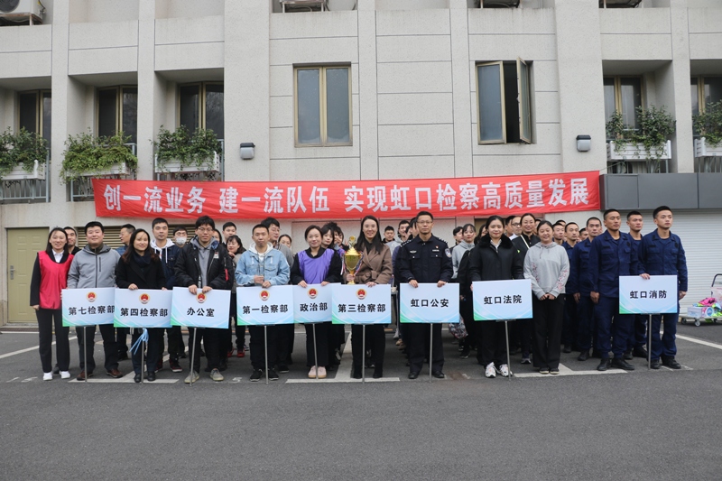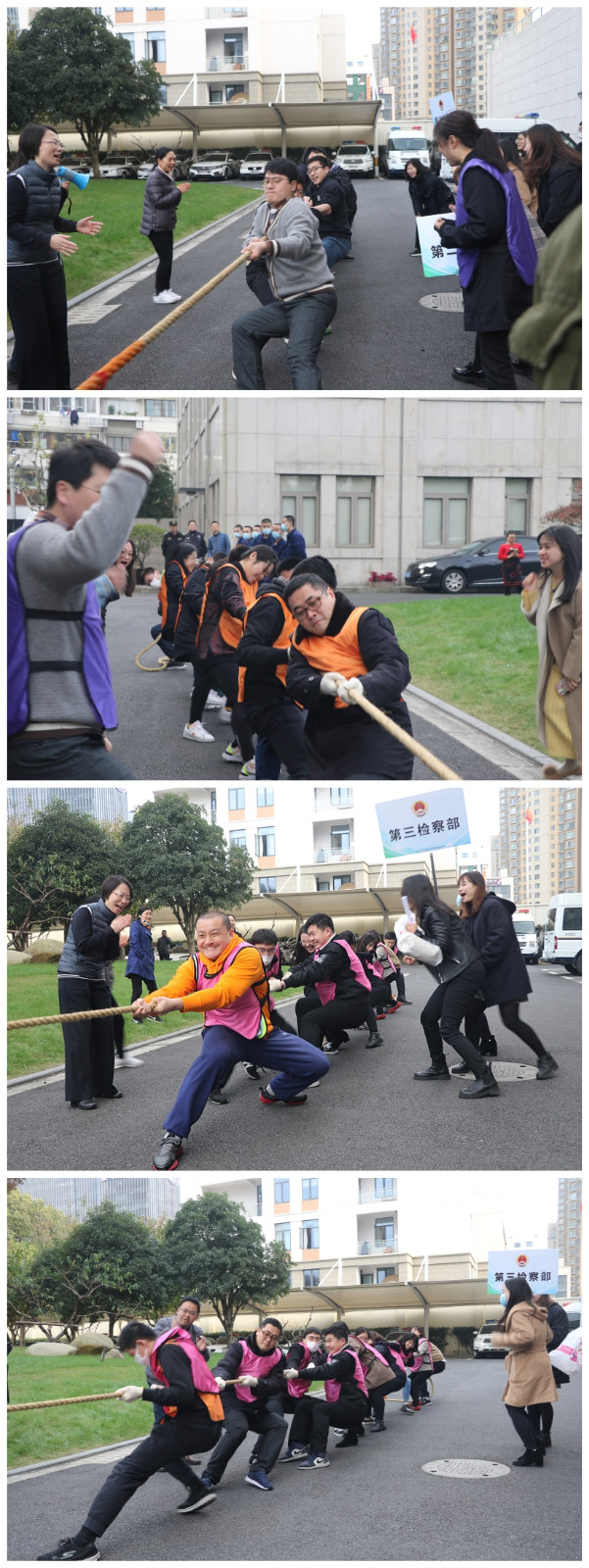 为进一步增强队伍的凝聚力和战斗力,更好发挥检察文化在队伍建设中的积极作用,近日,我院举行“创一流业务、建一流队伍、实现虹口检察高质量发展”拔河比赛。 本次比赛共有11个部门10支队伍报名参加,同时还邀请虹口法院、虹口公安、沪东检察院和虹口消防支队参加友谊赛。比赛开始前,院党组成员、副检察长陈卫民作了动员讲话,派驻纪检监察组组长张捷宣读了比赛规则并担任裁判。比赛中,各支队伍全情投入,一时间赛场上呐喊声、加油声此起彼伏,现场气氛热烈。最终,经过激烈角逐,第三检察部代表队荣获冠军,第一检察部代表队荣获亚军,政治部、第二检察部荣获季军。最后,院党组成员分别为获奖队伍颁发奖杯。
