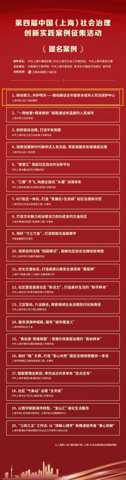 2021年12月30日,第四届中国(上海)社会治理创新实践案例正式发布,50件带有基层“烟火气”的鲜活案例揭示了上海践行全过程人民民主、深化治理数字化的探索成果。虹口这3个案例入选,虹口检察喜提1提名案例!