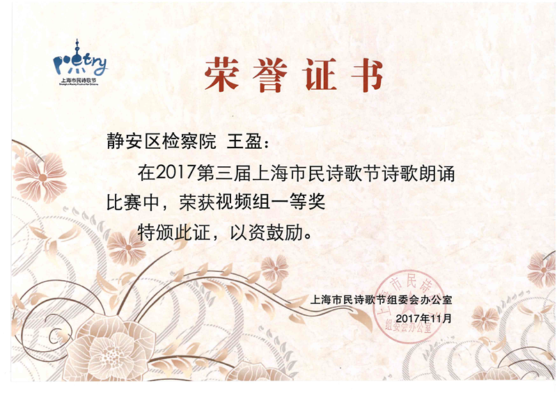 静安区检察院公诉科干警王盈荣获2017第三届上海市民诗歌节诗歌朗诵比赛视频组一等奖