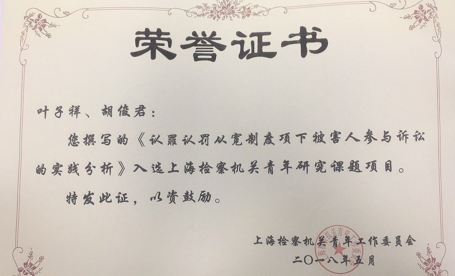 为进一步在青年干警中营造积极学习、踊跃参与的良好氛围,不断增强青年干警的学术深度与厚度,去年以来,区院青工支委、团总支组织青年干警积极参与市院青工委推出的“上海检察机关青年研究课题”项目,申报课题3个。近日,经前期评审、专题培训、课题研讨等环节,龙潭、胡璎、徐衍撰写的《未成年人检察社会服务体系的建设与运行模式》及叶子祥、胡俊君撰写的《认罪认罚从宽制度项下被害人参与诉讼的事件分析》等2个课题脱颖而出,入选上海市检察机关青年研究课题项目,并被授予荣誉证书。