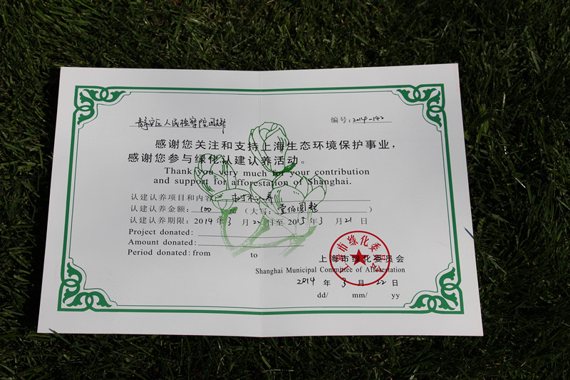 3月22日(周六)下午,2014年上海市静安区企事业单位、市民树木认养活动在延中绿地举行。上海市静安区检察院积极参与该项活动,青年检察官们以“静安检察院团支部”的名义,共同认养了中共二大会址门前的一棵树木,认养期为1年。检察官们表示:“绿色环保,人人有责,革命精神,代代相传。在中共二大会址前为绿化和环境出一份力,显得特别有意义。”