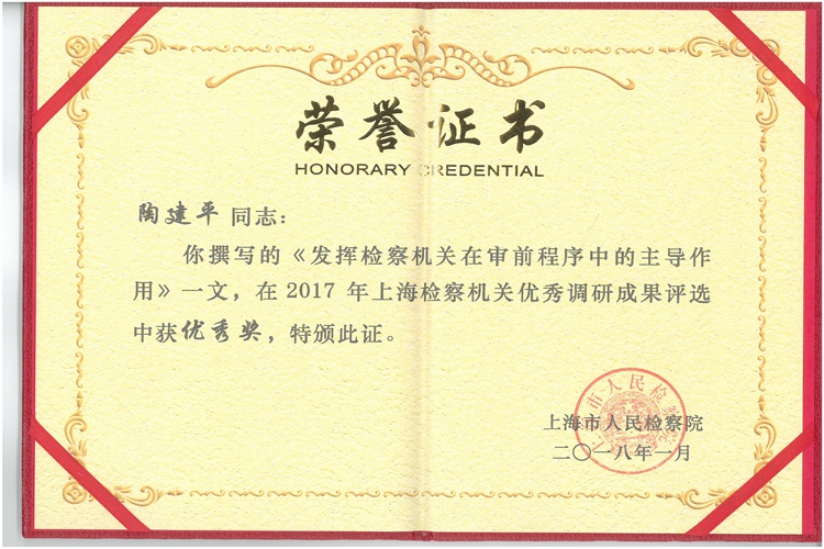 《发挥检察机关在审前程序中的主导作用》荣获2017年上海检察机关优秀调研成果优秀奖
