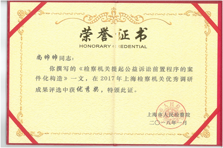 《检察机关提起公益诉讼前置程序的案件化构造》荣获2017年上海检察机关优秀调研成果优秀奖