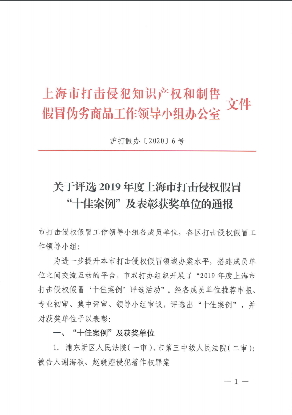 上海铁检院一起案例入选2019年度上海市打击侵权假冒典型案例