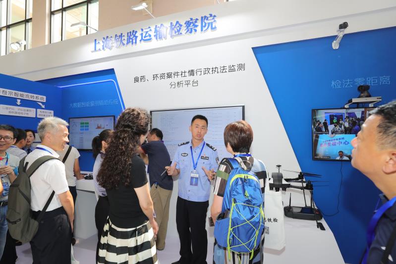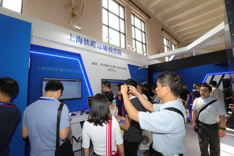 记者来到我院位于五号展馆的展区,争相探秘上海铁检“智慧检务”建设成果。展区将信息化技术和铁检智慧完美结合。五大系统联动综合智慧平台,(分别为1.智能卷宗数字化管理系统、2.智能量刑辅助系统、3.检法零距离办案系统、4.人像识别系统、5.公益诉讼及执法监督监测系统)联动智慧平台(案件数据、12309服务中心管控、案件地域性趋势分析、视频监控管理综合平台)。我院还借助人工智能机器人、无人机、移动办案箱、免拆扫描仪等高科技设备提升了办案效率。我院展区外形轮廓犹如“超级高铁”即将驶离车站,奔向检察科技创新的未来,格外引人注目。迎宾智能玻璃实时显示人像抓取状态, 高清4K显示屏动态播放该院“智慧检务”微电影《跨区院检察官的1天》,人工智能机器人“小法”现场展示法律问答,智能语音平台辅助办案录入,这些检察科技,让参观者直观地领略上海铁检院的“科技范”。