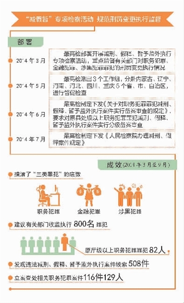 敢于监督、敢于纠正,专项检察活动交出了一份令人满意的答卷:一批违法减刑、假释案件被纠正,一批暂予监外执行罪犯被依法收监,一批徇私舞弊减刑、假释、暂予监外执行职务犯罪案件被立案查办。以广东省为例,2014年,包括深圳市原副市长王炬、广东省经协办经协集团原总经理冯科业等12名厅局级干部在内的138名罪犯,因不符合暂予监外执行条件被收监执行刑罚。广东检察机关还立案查处违法减刑、假释、暂予监外执行背后的职务犯罪16件16人。(陈梦琪)