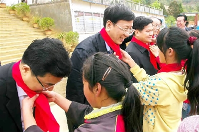 3月27日,共和国首席大检察官曹建明来到最高检资助兴建的云南省西畴县革岔民族希望小学,一名少先队员为曹建明系上鲜艳的红领巾。记者程丁 摄