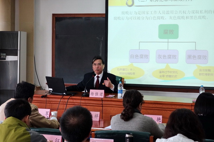 杨恒进检察长介绍了党的十八大以来党风廉政建设和反腐败斗争的形势、任务和取得的显著成效,结合检察机关主要职能和亲身办案经历,选用典型案例详细解读了常见多发的贪污、受贿、挪用公款、滥用职权等职务犯罪罪名,为干部们敲响警钟。此外,他还深刻分析了当前本市职务犯罪的现状、特点及其原因,提醒学员们正确对待自己手中的权力,牢记使命宗旨,始终保持清正廉洁的从政信念,加强自身修养,远离职务犯罪。