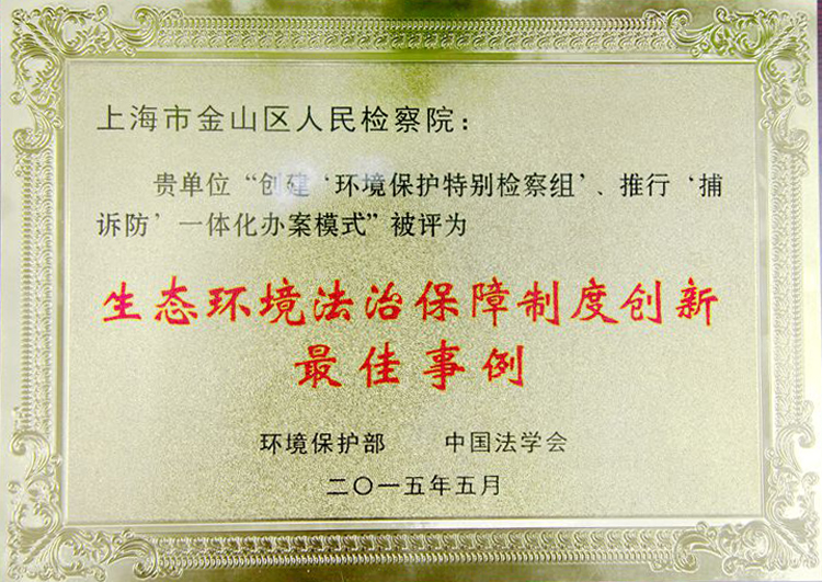 近日,在环保部、中国法学会联合主办的环境法治创新研讨会上,金山区检察院创建的“环境保护特别检察组”等工作模式获的“生态环境法治保障制度创新最佳事例”荣誉,相关做法也被收录事例集册予以推广。