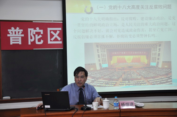 杨恒进检察长介绍了党的十八大以来党风廉政建设情况和反腐败斗争的新形势和任务,以及取得的显著成效。在当前检察改革的形势背景下,他结合检察机关的主要职能和亲身经历查办的典型案例,详细解读了职务犯罪等常见多发罪名,深刻分析了当前本市、本区职务犯罪的现状、特点及其原因,提醒学员们牢记历史使命宗旨,始终以对党和人民高度负责的态度,正确用好手中的权力,为普陀经济社会发展做出应有的贡献。