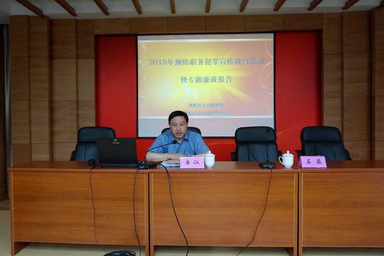为全力推进预防职务犯罪工作向基层延伸,普陀区检察院长征检察室于6月9日上午,在辖区内桃浦、真如两家市场监督管理所开展了2015年预防职务犯罪宣传教育活动。该院副检察长唐敏前往真如镇街道会场作专题廉政报告,区市场监督管理局副局长石骏及40多名基层行政执法人员参与了本次报告会。