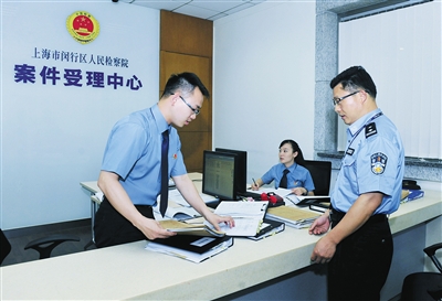 7月15日,上海市闵行检察院案件受理中心,正在接收公安机关移送的案件材料,受理后将按案件风险等级分给检察官。