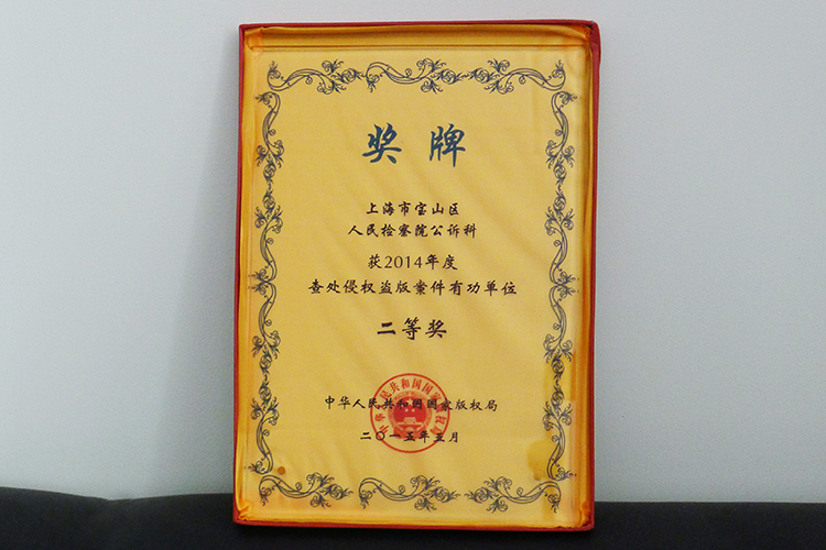 近日,宝山区检察院办理的“王某侵犯著作权案”获国家版权局颁发的“2014年度查处侵权盗版案件有功单位二等奖”奖牌。