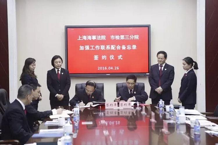 4月26日,市检察三分院与上海海事法院工作交流会在三分院召开。会上,宣读、签署了《上海海事法院上海市人民检察院第三分院关于加强工作联系配合的备忘录》并开展工作座谈。上海海事法院院长赵红、副院长荚振坤,市检察三分院检察长陆建强、副检察长谈信友以及两院相关部门负责人参加座谈会。