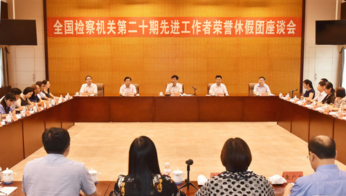 8月3日,最高人民检察院党组书记、检察长曹建明在北戴河看望慰问全国检察机关第二十期先进工作者荣誉休假团全体同志并同大家座谈。 本报记者程丁摄