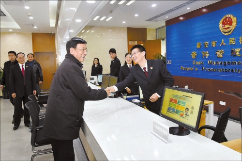 近年来,泰安市检察院积极顺应信息化发展潮流和司法体制改革要求,自主研发了智慧检务系统和检察官综合业绩评价系统。这两个系统有效对接全国统一业务应用系统、检察队伍管理系统、案件质量评查系统,积极应用信息化建设新技术,广泛挖掘和智能分析数据资源,打破信息壁垒,推动大数据与业务工作深度融合,实现对员额检察官的精准、系统、客观评价,取得了明显的效果。曹建明饶有兴致地观看了系统演示,不时插话询问。他充分肯定山东和泰安检察机关在智慧检务建设上的积极探索和主动作为,勉励大家要进一步强化大数据思维,在智慧检务建设中贡献更多山东智慧,创造更多山东经验。