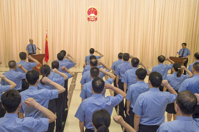 最高检党组副书记、副检察长邱学强主持宣誓仪式。奏唱国歌之后,张军监誓,最高检党组成员、副检察长童建明抚按宪法领誓,最高检机关新任职人员面对国旗国徽右手举拳庄严宣誓。宣誓后,张军发表了讲话。