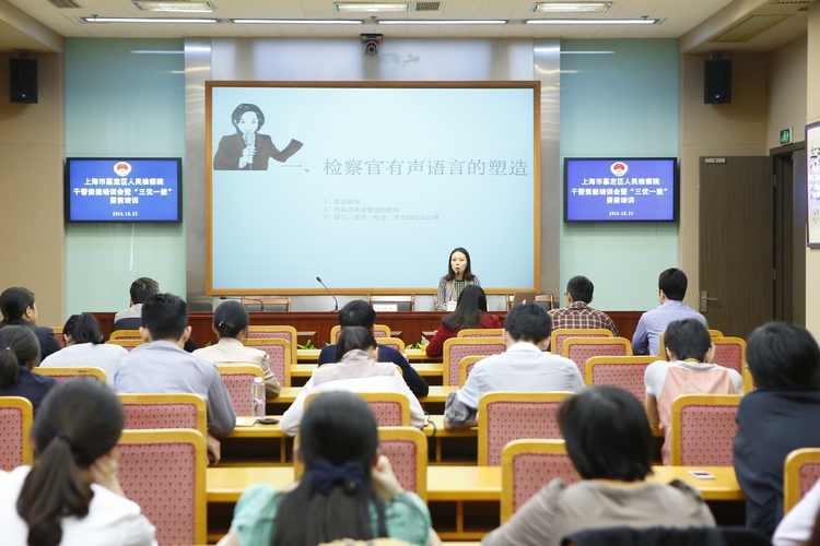 会上,姜老师从“有声语言”、“即兴口才”及“无声语言”的塑造几个方面进行了阐述,并对在座的干警提出建议,还在现场与干警进行模拟出庭、即兴演讲等互动。嘉定区院2014年度优秀公诉人、优秀办案能手等“三优一能”参赛选手、嘉检青年论坛成员和业务部门干警到场认真聆听。