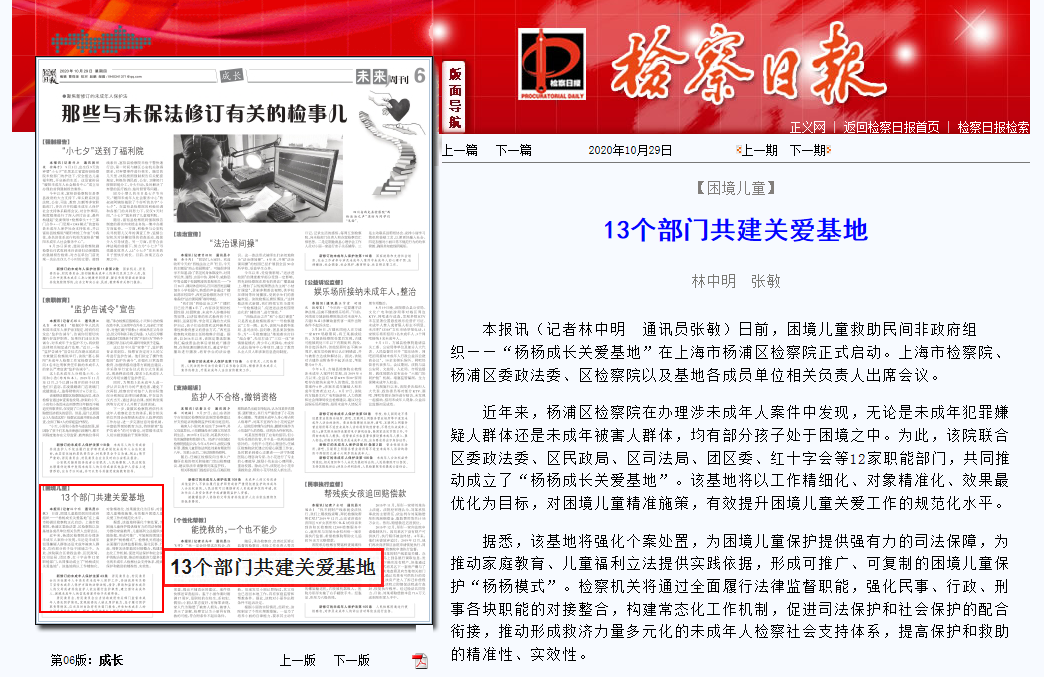 新修订的未成年人保护法10月17日经十三届全国人大常委会第二十二次会议表决通过,该法自2021年6月1日起施行。 【困境儿童】 13个部门共建关爱基地 日前,困境儿童救助民间非政府组织——“杨杨成长关爱基地”在上海市杨浦区检察院正式启动。上海市检察院、杨浦区委政法委、区检察院以及基地各成员单位相关负责人出席会议。 近年来,杨浦区检察院在办理涉未成年人案件中发现,无论是未成年犯罪嫌疑人群体还是未成年被害人群体,均有部分孩子处于困境之中。为此,该院联合区委政法委、区民政局、区司法局、团区委、红十字会等12家职能部门,共同推动成立了“杨杨成长关爱基地”。该基地将以工作精细化、对象精准化、效果最优化为目标,对困境儿童精准施策,有效提升困境儿童关爱工作的规范化水平。 据悉,该基地将强化个案处置,为困境儿童保护提供强有力的司法保障,为推动家庭教育、儿童福利立法提供实践依据,形成可推广、可复制的困境儿童保护“杨杨模式”。检察机关将通过全面履行法律监督职能,强化民事、行政、刑事各块职能的对接整合,构建常态化工作机制,促进司法保护和社会保护的配合衔接,推动形成救济力量多元化的未成年人检察社会支持体系,提高保护和救助的精准性、实效性。 新修订的未成年人保护法第43条 居民委员会、村民委员会应当设置专人专岗负责未成年人保护工作,协助政府有关部门宣传未成年人保护方面的法律法规,指导、帮助和监督未成年人的父母或者其他监护人依法履行监护职责,建立留守未成年人、困境未成年人的信息档案并给予关爱帮扶。 居民委员会、村民委员会应当协助政府有关部门监督未成年人委托照护情况,发现被委托人缺乏照护能力、怠于履行照护职责等情况,应当及时向政府有关部门报告,并告知未成年人的父母或者其他监护人,帮助、督促被委托人履行照护职责。 |