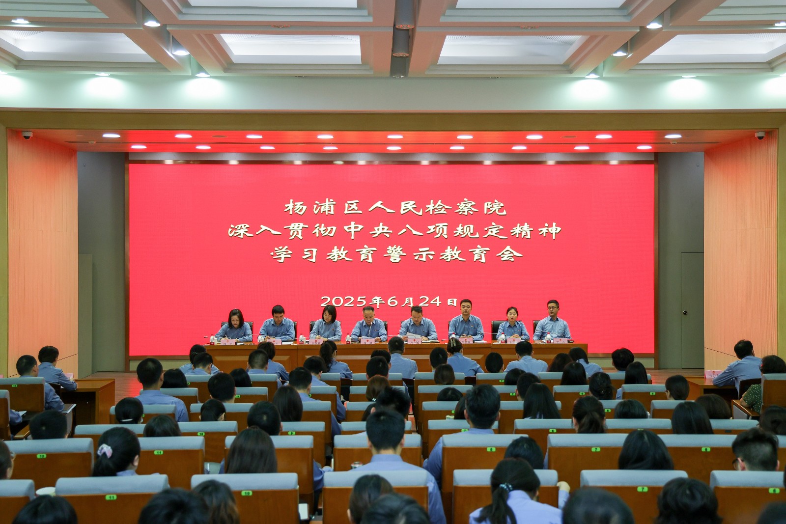 6月24日上午,杨浦区检察院召开深入贯彻中央八项规定精神学习教育警示教育会,全院干警、离退休党员代表参加。会上,传达了市委、最高检、市院、区委警示教育会精神,集中观看了《风·腐——杨浦区深入贯彻中央八项规定精神学习教育警示教育专题片》。党组书记、检察长康强主持会议并讲话指出,要深入学习贯彻习近平总书记关于加强党的作风建设的重要论述和关于开展深入贯彻中央八项规定精神学习教育的重要讲话重要指示精神,认真落实市委、最高检、市院、区委警示教育会精神,推动队伍自我革命,刀刃向内、刮骨疗毒,以严实作风为检察工作高质量发展提供坚强保障。