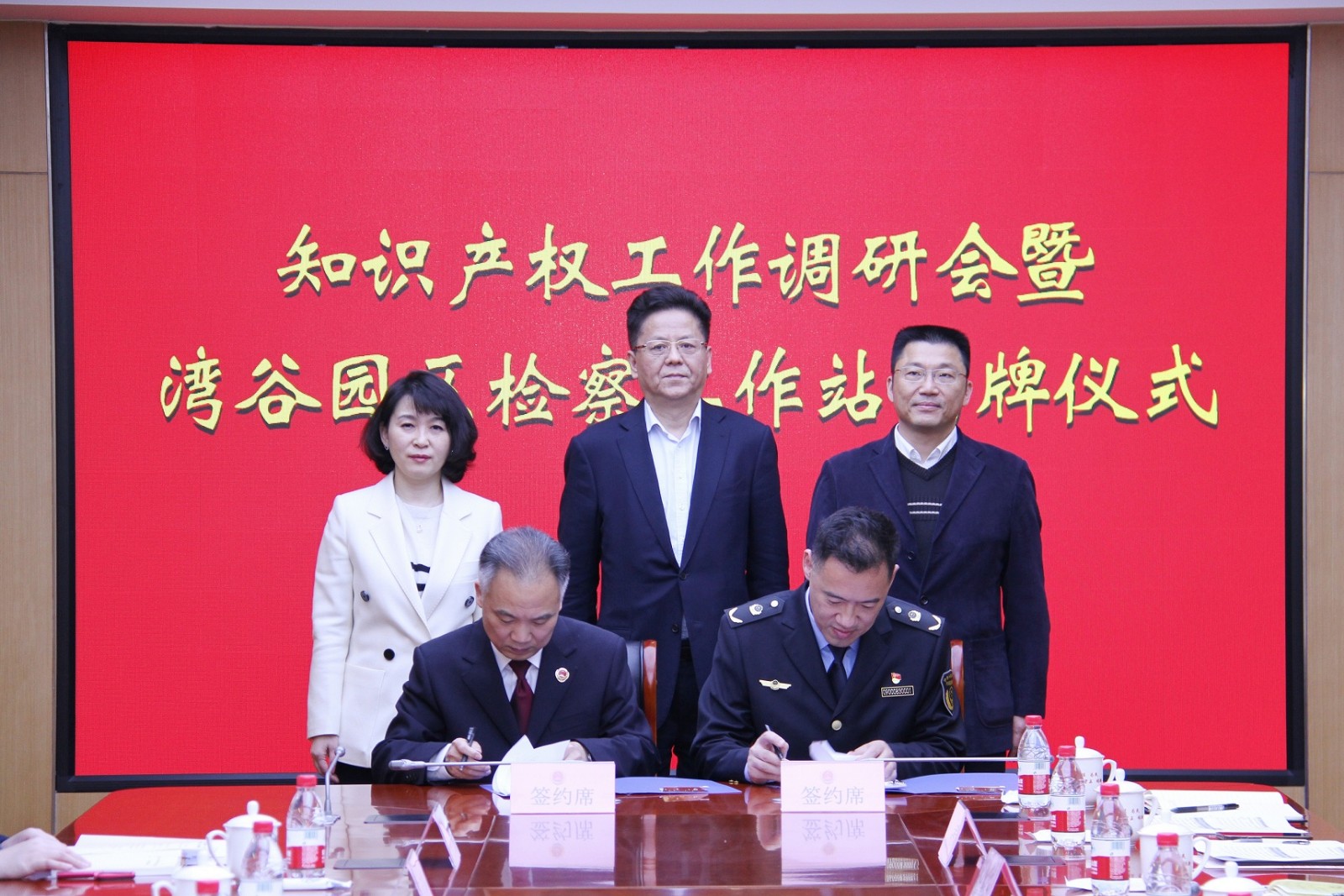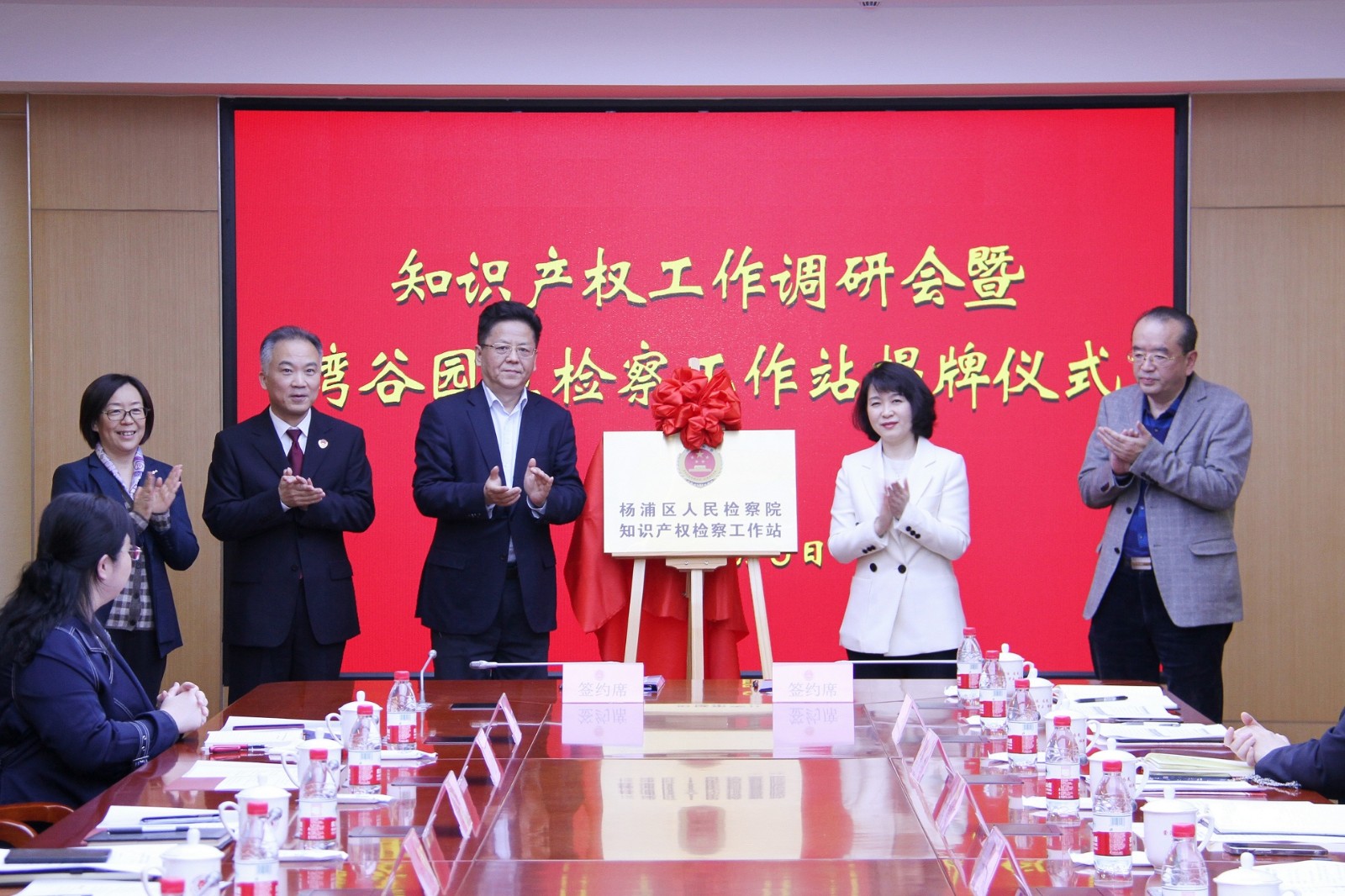 4月6日下午,杨浦区检察院举行湾谷园区“知识产权检察工作站”揭牌仪式。市检察院党组成员、副检察长龚培华,杨浦区委常委、政法委书记胡煜昂共同为“知识产权检察工作站”揭牌。杨浦区委常委、常务副区长尼冰,杨浦区检察院党组书记、检察长康强出席。市检察院相关部门机构负责人,杨浦区委政法委、区市场监督管理局(知识产权局)、区司法局及新江湾城街道相关领导应邀出席。揭牌仪式上,杨浦区检察院与杨浦区市场监督管理局(知识产权局)会签《杨浦区关于进一步强化知识产权司法、行政协同保护合作协议》。